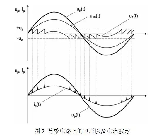 等效電路的電壓與電流波形如圖2所示。電壓UP(t)為施加在主絕緣上的系統(tǒng)電壓,U10(t)為空位上的電壓。當(dāng)U10電壓升高到空位的擊穿電壓UZ時(shí),空位擊穿,C1兩頭電壓下降,空位絕緣恢復(fù),同時(shí)C2被充電,當(dāng)U10高于擊穿電壓Uz時(shí),以上進(jìn)程重復(fù)發(fā)生。而每次局放時(shí),都將會(huì)在絕緣走漏電流上疊加一個(gè)小的脈沖放電,如圖2所示。經(jīng)過(guò)檢測(cè)放電脈沖發(fā)生的方位、時(shí)辰以及幅值,咱們能夠?qū)υO(shè)備的絕緣工作情況中止點(diǎn)評(píng)。