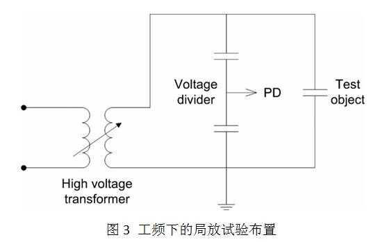 現(xiàn)在遍及認(rèn)為,50Hz電壓下的局放試驗(yàn)是運(yùn)用最為遍及的局放檢測(cè)方法,最為首要的緣由是工作電壓頻率為50Hz,局放檢測(cè)效果與實(shí)踐最為靠近。但是,輸電電纜線路長(zhǎng)度較長(zhǎng),對(duì)試驗(yàn)設(shè)備的容量懇求較高。圖3為工頻電壓下局放查驗(yàn)試驗(yàn)安排圖。分為變壓器、分壓器以及被試電纜三部分。
