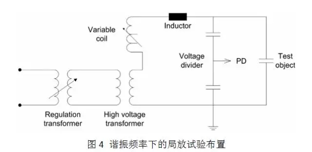 圖4為諧振頻率下的局放試驗(yàn)安排表明圖,與工頻電壓下的安排根本一起。根據(jù)IEC62067(≥245kV)與IEC60840(<245kV)標(biāo)準(zhǔn),電纜的試驗(yàn)頻率規(guī)模為20至300Hz。試驗(yàn)安排選用串聯(lián)諧振的方法,試驗(yàn)頻率如下所示。