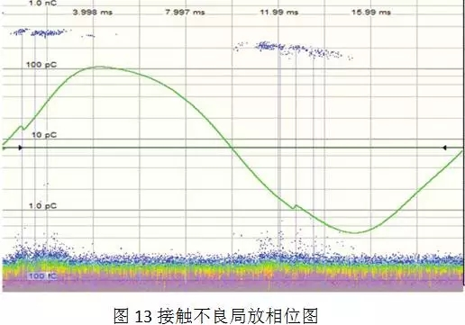 接觸不良金具聯(lián)接不良時(shí)也會(huì)引起局放的發(fā)生。金具聯(lián)接點(diǎn)的空位會(huì)發(fā)生電壓差,當(dāng)外加電壓足夠高時(shí)會(huì)引起空位擊穿。該品種型的局放相位圖相關(guān)于過(guò)零點(diǎn)是對(duì)稱的。如圖13所示。
