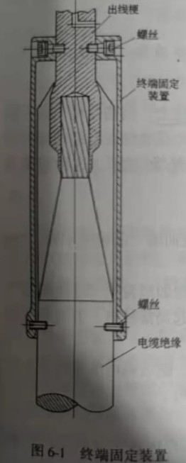 2.固定規(guī)劃:為了防止電纜絕緣回縮,在交聯(lián)電纜附件規(guī)劃當(dāng)選用電纜終端固定設(shè)備和接頭固定設(shè)備的電纜絕緣固定規(guī)劃。1)終端固定設(shè)備,是為防止電纜絕緣回縮,對(duì)終端特別規(guī)劃電纜固定設(shè)備。圖6-1是一種典型的規(guī)劃,采圖6-1終端固定設(shè)備8個(gè)螺絲將金屬筒固定在電纜終了。