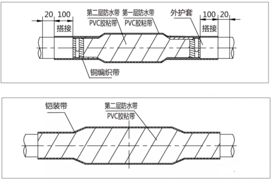 4)外護套防水處置(第二層):兩端鎧裝打毛,將防水帶拉長至約1.5倍以半搭疊方式從一端電纜外護套開端繞包至另一端電纜外護套上,請求與外護套搭接100mm。