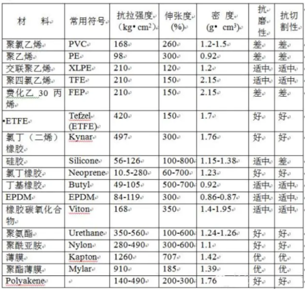 各種絕緣材料的物理性能: