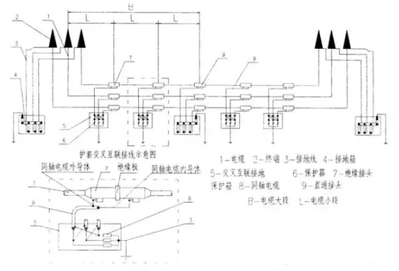 聯(lián)。這種方法是將線路分成長度相等的三小段或三的倍數(shù)段,每小段之間裝設(shè)絕緣接頭,絕緣接頭處三相屏蔽之間用同軸電纜,經(jīng)交叉互聯(lián)箱進行換位連接,交叉互聯(lián)箱裝設(shè)有一組護層保護器,線路上每兩組絕緣接頭夾一組直通接頭。(見下圖)