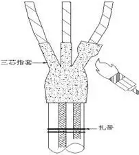 將電纜外護(hù)套端部向下100mm打磨擦凈,在電纜分支處纏繞填充膠填充飽滿,將兩根地線沿電纜拉直平行引出,并使用扎帶臨時(shí)固定;套入指套至分支根部,由指套中部向兩端加熱收縮。