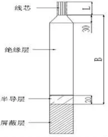 如圖4,尺寸剝除電纜屏蔽層、半導(dǎo)層、以及絕緣層(L=端子孔深+5mm),并且將電纜絕緣末端削成30mm長(zhǎng)的錐形。
