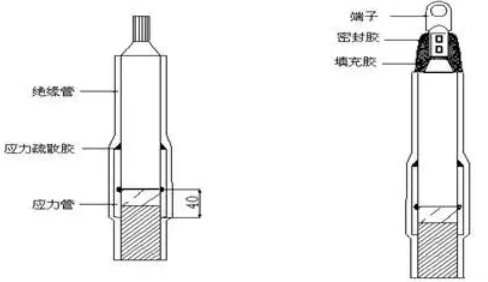 插入端子并壓接,壓接后去除毛刺和飛邊(如為三芯電纜,需保證端子端面方向一致)。在絕緣管斷口與端子之間以及端子壓接部位包繞填充膠,使絕緣管斷口與端子之間呈錐形過(guò)渡,再在其外面繞一層密封膠條。