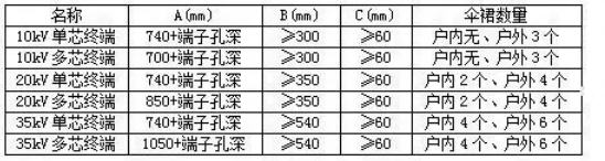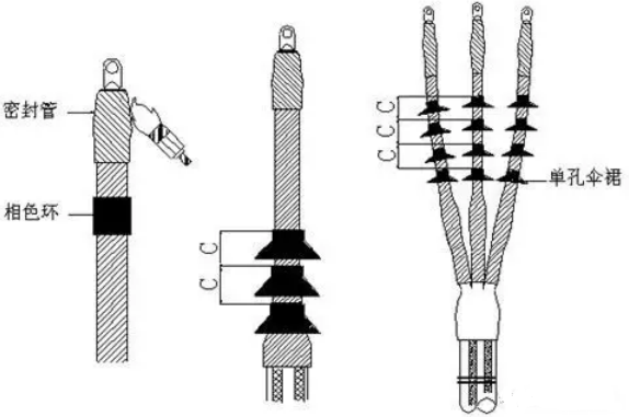 根據(jù)電壓等級(jí)及終端種類(戶外/戶內(nèi)),按需求的數(shù)量套入傘裙。第一個(gè)單孔傘裙的收縮位置為半導(dǎo)層斷口處,其他傘裙根據(jù)圖示尺寸依次收縮固定。終端安裝完畢。
