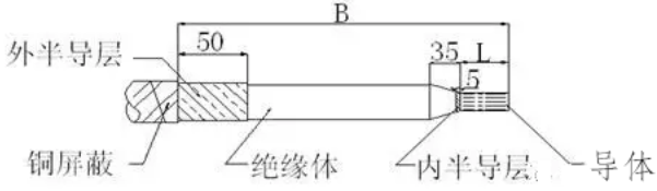 如圖8,尺寸剝除電纜銅屏蔽層、半導(dǎo)層、以及絕緣層(L=1/2連接管長(zhǎng)度+2mm),并且將電纜絕緣末端削成35mm長(zhǎng)的錐形(其中5mm為外露的內(nèi)半導(dǎo)層)。