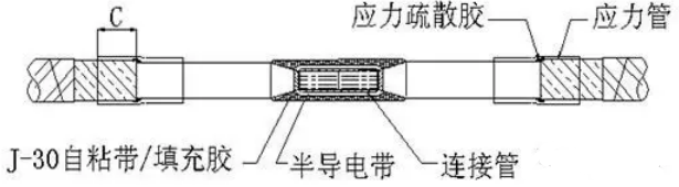 打磨并清潔線芯絕緣層,確保表面無(wú)導(dǎo)電顆粒殘留,在外半導(dǎo)層斷口處纏繞應(yīng)力疏散膠,搭接絕緣層及外半導(dǎo)層各5mm,在絕緣層表面均勻薄涂一層硅脂膏,應(yīng)避免涂在外半導(dǎo)層上。套入應(yīng)力管,搭接半導(dǎo)層C,加熱收縮固定(如應(yīng)力管為通長(zhǎng)型,則應(yīng)在導(dǎo)體連接后再固定。