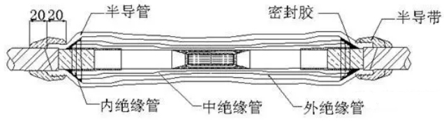 將內(nèi)、外護(hù)套分別套進(jìn)兩端電纜,在電纜護(hù)層被剝除較長(zhǎng)的一端每相分別套入一組內(nèi)絕緣管、中絕緣管、外絕緣管和半導(dǎo)管(20kV以下無(wú)中壁管,外絕緣管和半導(dǎo)管也可使用復(fù)合管替代),在短端每相套入一段銅屏蔽網(wǎng)(以纏繞的方式恢復(fù)金屬屏蔽層則不需套入)。按原定相序?qū)⒕€芯插入連接管并進(jìn)行壓接,去除連接管表面的毛刺、棱角,并將廢屑清理干凈。先用半導(dǎo)帶纏繞在連接管表面,使其和兩端的內(nèi)半導(dǎo)層相連,再將填充膠(20kV以上纏繞J-30絕緣自粘帶)纏繞與半導(dǎo)帶外及絕緣錐體部位,厚度為高出電纜本體絕緣外徑1-2mm,兩端搭接電纜本體絕緣5mm,并與其平滑過(guò)渡。