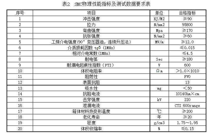 2.3.1分支箱外殼選用S304不銹鋼資料,箱體、門體資料厚度均不應小于2毫米,或SMC復合資料箱體,SMC物理功用目標及測試數(shù)據(jù)滿足表2的要求。