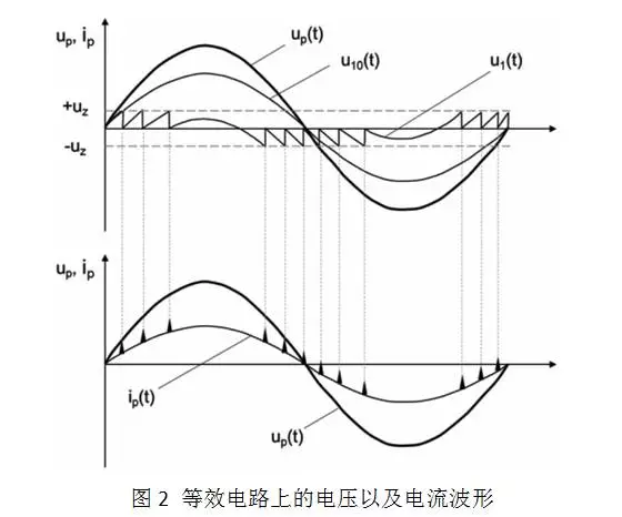 等效電路的電壓與電流波形如圖2所示。電壓UP(t)為施加在主絕緣上的系統(tǒng)電壓,U10(t)為空隙上的電壓。當(dāng)U10電壓升高到空隙的擊穿電壓UZ時,空隙擊穿,C1兩端電壓下降,空隙絕緣恢復(fù),同時C2被充電,當(dāng)U10高于擊穿電壓Uz時,以上過程重復(fù)發(fā)生。而每次局放時,都將會在絕緣泄漏電流上疊加一個小的脈沖放電,如圖2所示。通過檢測放電脈沖發(fā)生的位置、時間以及幅值,我們可以對設(shè)備的絕緣運行狀況進行評價。