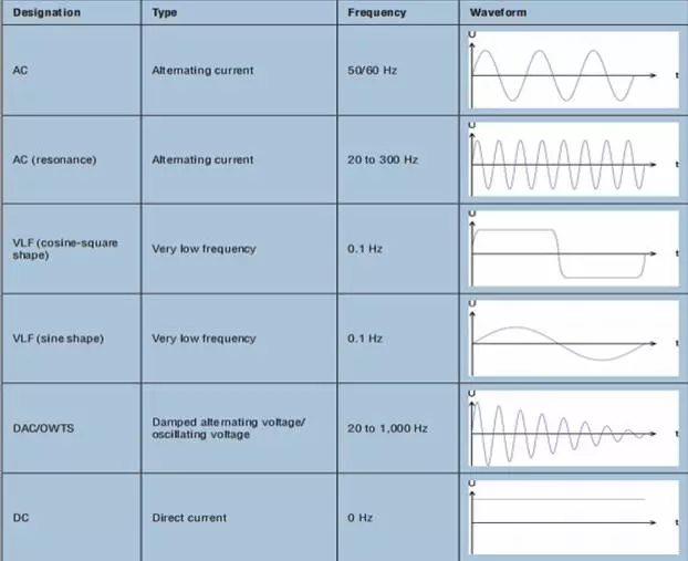 IEC60060規(guī)定,0.1Hz的電纜局放試驗波形,可以采用正弦波或方波。由于電壓頻率較低,電纜的充電效應(yīng)大大減弱,試驗電源的容量也隨之減?。üゎl下的1/500)。相同時間下超低頻試驗電壓過零次數(shù)遠小于50Hz工頻試驗,因此其局放重復(fù)次數(shù)要小于工頻試驗,通常不能采用局放重復(fù)次數(shù)來評價電纜或附件的運行狀況。對于含有非線性電阻的電纜附件,不宜采用超低頻試驗,因為可能會對絕緣產(chǎn)生損傷。