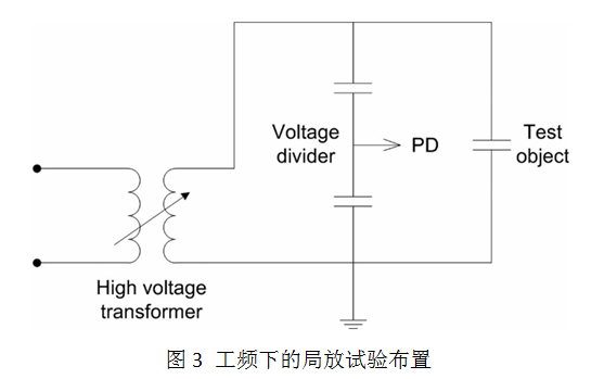 目前普遍認(rèn)為,50Hz電壓下的局放試驗是應(yīng)用最為廣泛的局放測量方法,最為主要的原因是運行電壓頻率為50Hz,局放測量結(jié)果與實際最為接近。然而,輸電電纜線路長度較長,對實驗設(shè)備的容量要求較高。圖3為工頻電壓下局放測試試驗布置圖。分為變壓器、分壓器以及被試電纜三部分。