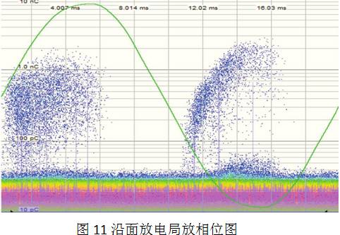 沿面放電主要發(fā)生在電場切線上,放電量較其他局放形式更大。沿面放電的局放量在100 pC至1000 pC,并且總是在過零點之后出現(xiàn)。由于沿面放電閃絡(luò)距離更大,對設(shè)備的絕緣性能影響至關(guān)重要。根據(jù)局放放電相位圖(圖11),第三象限下的放電量要大于第一象限。