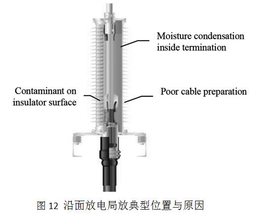 沿面放電主要發(fā)生在電纜終端,如圖12所示。原因主要有:安裝過程中終端內(nèi)表面臟污,此時放電主要發(fā)生在電纜電場集中的應(yīng)力錐處。當(dāng)電纜終端進潮氣以后,在低溫下凝露會造成內(nèi)表面放電。