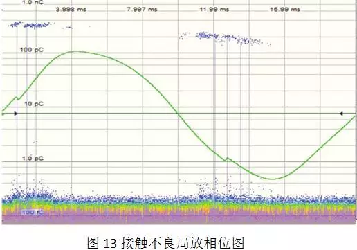 接觸不良金具連接不良時也會導(dǎo)致局放的發(fā)生。金具連接點的空隙會產(chǎn)生電壓差,當(dāng)外加電壓足夠高時會導(dǎo)致空隙擊穿。該種類型的局放相位圖相對于過零點是對稱的。如圖13所示。