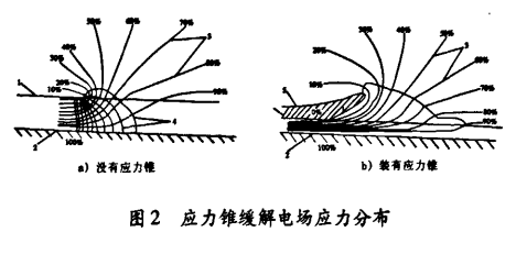應(yīng)力錐則利用部件幾何形狀來控制電場(chǎng)應(yīng)力,對(duì)材料電氣性能參數(shù)要求不高,體積電阻率在1~100·cm就可滿足.幾何形狀通過模具成型很容易得到保障,參數(shù)基本不會(huì)發(fā)生偏差.因此,應(yīng)力錐結(jié)構(gòu)的電纜附件比應(yīng)力管結(jié)構(gòu)的電纜附件可靠性要高得多,應(yīng)力錐緩解電場(chǎng)應(yīng)力分布如圖2所示。